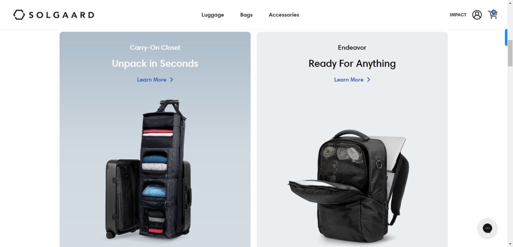 - Carry-On Closet 2.0: For frequent travelers, the Carry-On Closet 2.0 is a game-changer. This compact suitcase expands into a portable closet, complete with shelves and compartments for organized packing. Made from recycled materials, it showcases Solgaard’s commitment to sustainability without compromising on style or functionality.